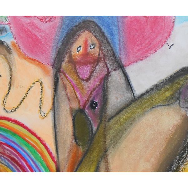 Dans le bas du dessin du visage, il subsiste des personnages encore dans la confusion. Entre une bonne s½ur, un chinois et même un requin, des éléments apparaissent, se surajoutent, changent. Il commence par la bonne s½ur, qui se trouve dans la bouche du personnage, confondue avec elle. Selon la façon de regarder le dessin, il est possible de voir la bouche ou le personnage, dans une sorte de trompe l’½il, confusionnel. Cette fois, il ne s'agit pas de travailler sur la contenance, qui est déjà un peu plus rétablie. Le dessin de la bonne s½ur est d’abord un visage plutôt flou, qu’il recouvre ensuite de noir, corps et visage se mélangeant. Il remet du blanc, du jaune, bref travaille sur cette zone avec force couches. Il parle de la bonne s½ur, qui doit être bonne, en tout cas meilleure que sa s½ur et il refuse de parler de cette dernière, qu'il pourra aussi nommer, à certains moments, le chinois.